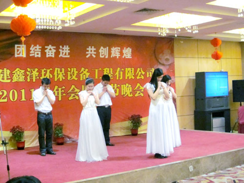 首先,由吴金泉董事长作了精彩致辞,他指出2011年我们必须创新、创优、革新,进一步抓好科研、生产与管理,为实现十二五规划目标献计出力。当晚,台上节目接踵而至,赢得台下掌声阵阵。研发中心自创的三句半,三男一女台上站,锣鼓齐响,配上应景顺溜的短句,令人赞不绝口;手语《感恩的心》优雅沉缓,感动之余令人深思;六六大顺合唱团,六男六女齐唱《大团圆》,表达团圆之喜悦,送出新年之祝福;由工程副总林顺金亲自创作的诗朗诵——《鑫泽我们的家》、《明天更辉煌》气势磅礴,带给大家不一样的享受和感动;营销部林世峰一曲《康巴汉子》带来高原风、草原情……福大老教授协会对本次晚会鼎力支持,为我们表演了二胡齐奏、表演唱等精彩节目,阵容强大、星光闪烁,为晚会增添了一抹亮丽。