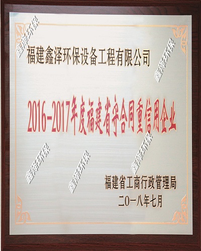 根据福建省工商行政管理局发布的福建省工商局关于公示2016—2017年度“福建省守合同重信用企业”的公告名单,授予“福建鑫泽环保设备工程有限公司”等1290家企业为“2016-2017年度福建省守合同重信用企业”。获此项殊荣是社会各界对鑫泽环保公司诚信经营的肯定,是各级政府和社会各界对鑫泽环保长期履行社会责任、诚信守法工作的充分肯定和积极鼓励,也是对公司诚信建设累累硕果的再次鉴证。